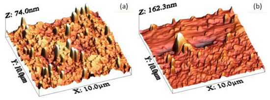 Topography of KNN thin films deposited on Pt/SiO2/TiO2/Si (a) and Pt/SrTiO3 (b) substrates.