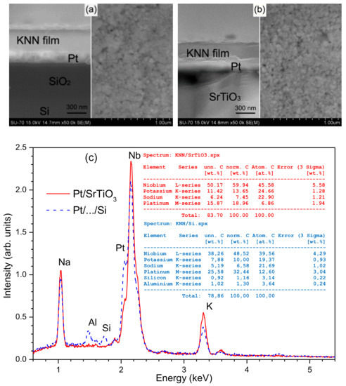 Cross-section (left) and top-view (right) SEM micrographs of KNN films on Pt/TiO2/SiO2/Si (a) and Pt/SrTiO3 (b) substrates, as well as their energy-dispersive spectra with quantifications (c).