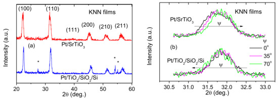 XRD profiles in 20°–60° 2θ range (a), and around (110) peak of KNN at different tilt angles ѱ used for stress calculations (b) of KNN films on Pt/SrTiO3 and Pt/TiO2/SiO2/Si substrates at room temperature. Diffraction peaks of KNN phase are marked by corresponding indexes, while those from substrate are marked as * in (a).