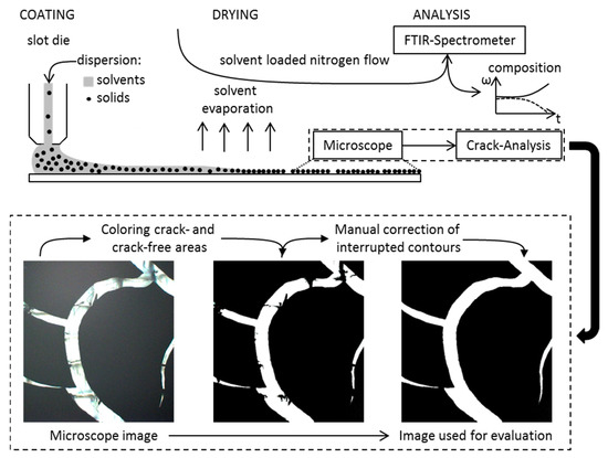The production process is schematically illustrated in the upper section of the figure. A PTFE substrate is coated with dispersion by the use of a slot die. The solvent is evaporated under controlled conditions. The drying is analyzed by FTIR-spectroscopy and the data used for a time-resolved calculation of the layer composition. The dried layer is recorded with a microscope and the pictures obtained are processed (lower part) for evaluation of the crack area ratio.
