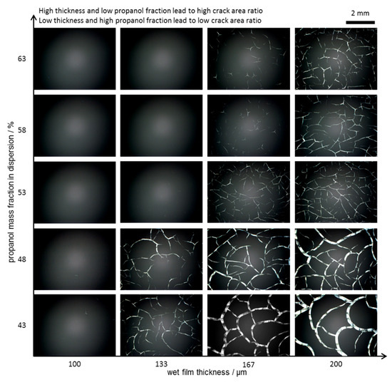 The microscope records are shown in Figure 2 and visually illustrate the dependence of the crack behavior from both the wet layer thickness and propanol mass fraction in the dispersions. High wet layer thickness and low propanol content promote the cracking of the layer. Figure 3 shows the crack area ratio of the layers quantitatively confirming the visual assumption. At a wet layer thickness of 100 µm, no sample showed a significant number of cracks meaning the critical tension was not exceeded. At 133 µm cracking occurred for the dispersions used with a propanol content of 43 wt.% as well as for a content of 48 wt.%. In the case of the other dispersions (53 wt.%, 58 wt.%, and 63 wt.% propanol content), the first cracks were found at a wet film thickness of 167 µm. Regarding the two dispersions with the highest alcohol content the crack behavior was too similar to be distinguished. Clearly, the effect of inhibiting crack formation by adding propanol is limited. The layer generated from 48 wt.% propanol-containing dispersion at 133 µm and that generated from dispersion containing 53 wt.% at a wet layer thickness of 167 µm have the same crack area ratio; however, different single crack sizes were obtained as can be seen in Figure 2 as well. The dispersion with 48 wt.% alcohol content showed crack sizes of up to 80 µm and an average crack width of 31 µm compared with maximum crack sizes of 33 µm and an average crack width of 16 µm for that with 53 wt.% propanol content. The same relationship resulted when comparing the 167 µm thick layer produced from the dispersion containing 43 wt.% propanol with the 48 wt.% propanol-containing dispersion at 200 µm.