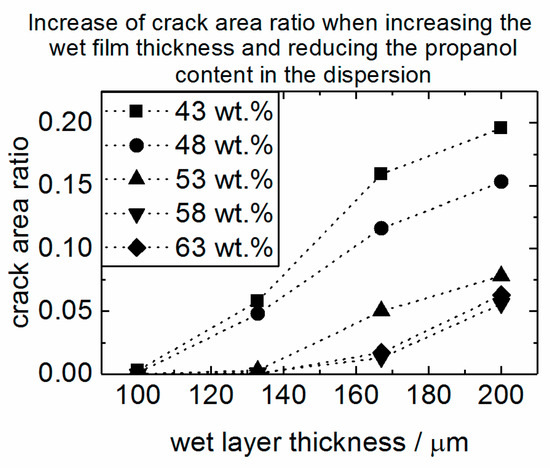 At first glance, these results are not surprising since propanol acts as a surfactant; therefore, added propanol decreases the surface tension of the dispersion. According to the table of surface tension for water propanol mixtures, the surface tension does not strongly decrease between 40 wt.% (σ = 24.09 mN·m−1) and 60 wt.% (σ = 23.33 mN·m−1) at 40 °C [17]. This relative difference of less than 4% in the surface tension is too small to explain the difference resulting from the images (see Figure 2) and their crack area ratio analysis (see Figure 3). It is assumed that the critical thickness is approximately 30% higher when reducing the propanol content in dispersion from 53 wt.% to 48 wt.%.