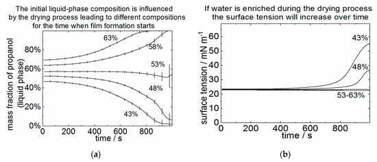 Figure 4 shows the development of the mean liquid phase composition over the entire layer as a function of drying time for all five dispersions used. The curves show different progression of the mass fraction of propanol as a function of time depending on the initial propanol content. When containing 43 wt.% and 48 wt.% of initial propanol the alcohol was depleted over the drying time. Consequently, the surface tension was increased when the layer structure formed. The difference in the structure images results from the different propanol fraction since in water-rich phases the surface tension is strongly affected by marginally adding propanol. In contrast to the depletion of propanol, an enrichment of propanol was observable when drying the 58 wt.% and the 63 wt.% propanol-containing dispersions. In a propanol-rich liquid-phase the surface tension will not drop significantly even if high amounts of propanol will be added. For this reason, no significant differences were observable in either their crack area ratio or crack size (compare Figure 2 and Figure 3). In the case of the 53 wt.% propanol-containing dispersion, the liquid phase is constant over the entire drying period. The surface tension remains at the initial value of the solvent mixture, which is known as the dynamic azeotropic point of the evaporation. For this reason, the layer formation is similar to layers produced using a dispersion with higher propanol content.
