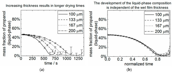 The mass fraction of propanol in the liquid phase of the 43 wt.% propanol-containing dispersion as a function of the drying time (a) and the normalized drying time (b) at difference wet layer thicknesses.
