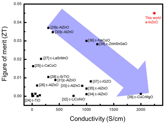 Previous studies about TE materials as transparent conductive oxides (TCOs) were focused on correlation between figure of merit (ZT) and carrier concentration or a crystal structure. Figure 1 shows ZT values of our results and previous studies as a function of conductivity [24,25,26,27,28,29,30,31,32,33,34,35,36,37,38,39]. The ZT measured at other temperatures were calculated to 300 K. The previous studies’ ZT values were high at low conductivity and decreased with increasing conductivity while our results show high ZT with high conductivity. These results are due to the trade-off relationship between Seebeck coefficient and carrier density and the carrier density being proportional to conductivity. Therefore, research about high ZT thin film with high electrical conductivity is needed.