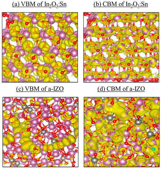 Atomic structure and electron densities of the band edges of polycrystalline In−Sn−O (c-ITO) and disordered amorphous In−Zn−O (a-IZO) generated by molecular dynamics simulation (a) valence band maximum (VBM), (b) conduction band minimum (CBM) of c-ITO, (c) VBM and (d) CBM of a-IZO. Except VBM of a-IZO, all wave-functions are well-delocalized. The pink and red balls represent In and O atoms, respectively, and grey balls represent the Sn atom in (a,b), and Zn in (c,d). The isosurface was selected at 0.0003 e/supercell.