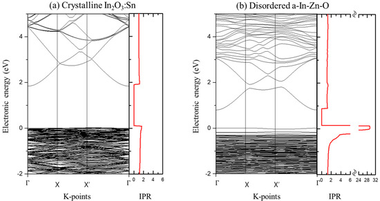 The IPR = 1 describes that a wave function is equally distributed over all atoms. The larger value of IPR indicates the more serious localization at some atoms. The calculated results of IPR(E) depending on the energy are shown at the right of the band structures in Figure 3. The calculated IPR indicate that the conduction band edges of both c-ITO and a-IZO are similarly well delocalized, and the IPR values are about 1.2 for both c-ITO and a-IZO. These results indicate that a-IZO should have good electrical conductivity and high μ, comparable to those of c-ITO. On the other hand, around the VBM, some localized band tail states develop in the a-IZO, differently from the c-ITO. The IPR value at VBM of a-IZO becomes 29.3. Furthermore, the band dispersion at the VBM of a-IZO is nearly flat. Thus, it is expected that the hole carrier mobility is low in a-IZO.