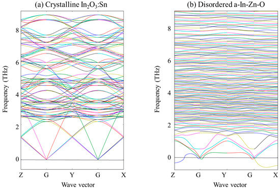 Calculated dispersion relations of phonon states by the first-principles calculation are compared between (a) crystalline In55Sn9O96 and (b) disordered amorphous In54Zn8O88 generated by the ab-initio molecular dynamics simulation. Here, Z, Y, X, and G are (0,0,1/2), (0,1/2,0), (1/2,0,0), and (0,0,0) points in the Brillouin zone, respectively.