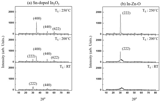 Figure 5 shows the XRD patterns of the ITO and IZO thin films deposited at various temperature: RT, 200, and 250 °C. In the ITO films, all films showed the character of crystallized structure, regardless of substrate temperature (TS). The sample deposited at RT shows a prevalent preferred orientation C (222). However, the sample deposited at 200 and 250 °C shows a preferred orientation of (400). The peak intensity increased relative to TS, and the C (400) peak that appears near 2θ = 35° sharply increased. In general, the ITO thin film shows a preferential orientation, as indicated by the C (222) peak. However, in this case, the ITO film shows a C (400) preferential orientation caused by high energy bombardment, which occurs during relatively long deposition times, compared to the ITO thin film with thickness of 150 nm. It is well known that reflected neutral Ar and negative oxygen ions form during sputtering, and these high-energy particles cause the sputtered films to crystallize during deposition [48,49,50,51].