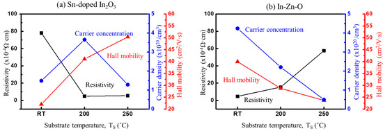 In Figure 6, we compare the resistivity, carrier density (n), and μ of (a) ITO and (b) IZO thin films deposited at RT, 200, and 250 °C. Notably, the resistivity of the ITO film decreased at higher TS values, whereas that of IZO increased. Even if the a-IZO film deposited at RT is in the amorphous state, it shows the lowest resistivity (4.644 × 10−4 Ω·cm), highest μ, and highest n values. The high n value should be due to non-stoichiometry by oxygen deficiency. As TS increase, both μ and the n decrease, which are understood to be due to improved crystallinity that causes decrease of oxygen vacancy.
