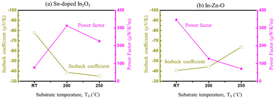The highest PF value (310.4 μW K−2 m−1) was observed in ITO deposited at 200 °C, whereas the highest PF value was observed in the a-IZO sample deposited at RT (PF: 354.6 μW K−2 m−1). PF was calculated by Equation (2), and the electrical conductivity was calculated using σ = neμ. In Equation (2) S and the conductivity values show a trade-off with respect to n, since σ ~ n, whereas S ~ 1/n. On the other hand, the electrical conductivity is proportional to µ.