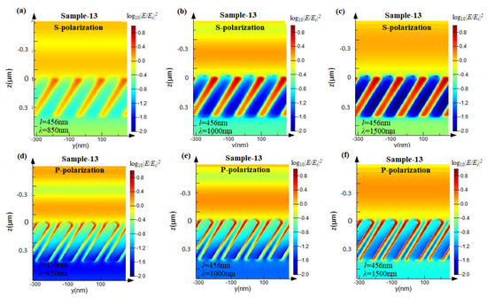 To gain insight into the broadening of the extinctance spectra, the electric field profiles of the TiN NRAs that were illuminated by s- and p-polarized light waves were simulated using the finite-difference time-domain (FDTD) (Lumerical FDTD Solutions 8.11.337) method. The following parameters were used in the simulations: FDTD cell size Δx = Δy = Δz = 2 nm, and the time step Δt = 0.95/c(Δx2 + Δy2 + Δz2)−0.5, where c is the speed of light, chosen according to the Courant stability criterion. The (x, y, z) coordinate system is oriented as in Figure 10a. According to the SEM of TiN NRA in this work, the surface roughness of the rod is less than 10 nm, which is much smaller than the wavelength. In a previous work, the polycrystalline TiN thin films were routinely fabricated by magnetron sputtering with a substrate temperature in the range of 300–600 K [29]. Our deposition condition would lead to polycrystalline structures. The refractive index of polycrystalline TiN was utilized in the simulations. The optical constants of the TiN film were taken from Sample-2. The TiN nanorods were arranged consistent with the morphologies of Sample-13 and Sample-14. Two slanted NRAs with rod lengths of 456 and 730 nm were simulated. Light waves with s- and p-polarization are normally incident onto the TiN NRA; the electric field intensity is defined as |E/Ei|2, where Ei and E are the amplitudes of the incident electric field and the localized electric field, respectively. The arrangement of TiN NRA is according to the morphology from SEM for simulation. Figure 10 also shows the simulated and measured extinctance spectra. The average difference between simulated extinctance and measured extinctance over wavelengths from 400 to 1000 nm is 7.1% for Sample-13 and 0.1% for Sample-14. Figure 11 plots the electric field intensity distributions in cross-sections (y–z plane) at x = 0 on a logarithmic scale. The electric field intensities were calculated at three wavelengths: 850, 1000, and 1500 nm. The field intensity distributions in the cross-sections reveal the mechanism of light absorption. For s-polarization, the strong electric field is localized in narrow gaps between TiN nanorods. The field in the gap is strongest close the surface. As the wavelength increases, the field enhancement extends deeper. Therefore, longer nanorods support more hot spots in the gaps. The field intensity at the bottom of 456 nm long nanorods is higher than that at the bottom of 730 nm long nanorods, indicating that the transmission decreases as the length of the rods increases, so the extinction of the NRA increases with the length of the rods. For p-polarization, the electric field is strong on the lateral surface of each nanorod. For 456 nm long rods, the field is strong from the top to the bottom and the hot spots extend to the bottom of the NRA, causing the transmission of light through the sample. For the 730 nm long rods, the field is strong from the top to a depth of 500 nm (z = 500 nm). Therefore, the field intensity at the bottom is extremely low, so transmission is low and the extinction is high.