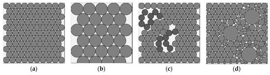 Figure 2. (a) Smaller particles with a surface density of 88%; (b) larger particles with a surface density of 78%; (c) flocculation with a surface density of 82%; (d) polydispersity with a surface density of 90%. - With decreasing particle size, the surface/weight ratio increases; thus, the impact of the interaction forces increases. Typically, gravitational force dominates the interparticle forces for larger particles (>50 µm) [61]. Hence, larger particles do not agglomerate, whereas smaller particles flocculate if the attractive forces (i.e., Van der Waals force) dominate over the repulsive forces (i.e., electrostatic force) [63]. During particle agglomeration, the gap between the agglomerates and other particles increases. Thus, the particles form a thick flotation layer, and the volume density of the layer decreases [61,63] (Figure 2c).