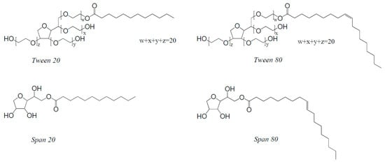 Another influencing factor during suspension production are the chemical and steric structures of the used surfactants [28,29,31,84]. Correspondingly, unsaturated bonds in the dispersed phase were rather attracted by unsaturated chains in the surfactant, and vice versa. Unsaturated bonds were present in Tween 80 and Span 80, whereas completely saturated bonds were present in Tween 20 and Span 20 (Figure 6). Hence, smaller particles with T2S2 blends are probably related to the affinity of saturated alkanes of the candelilla wax for the saturated chains of the surfactant [75,85]. In addition, the CPP (i.e., the packing tightness of the surfactant molecules on the wax surface) was greater for smaller molecules and shorter polyoxyethylene chains (Figure 6) [28,42].
