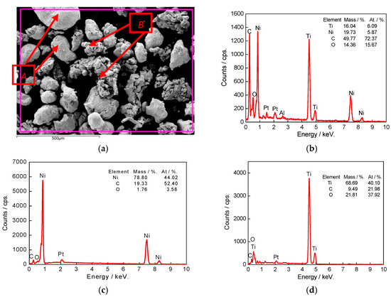 3.1. Morphologies and EDS Analysis of Ti–Ni Powder