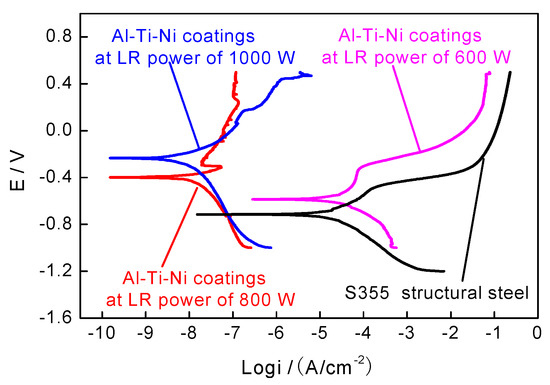 - Amorphous phases are detected in the Al–Ti–Ni coating at the LR powers of 600, 800, and 1000 W, and their corrosion potentials are higher than that of S355 steel; this indicates that the laser-remelted Al–Ti–Ni coating improves the electrochemical corrosion resistance of S355 steel. The electrochemical corrosion resistance increases with increasing LR powers.
