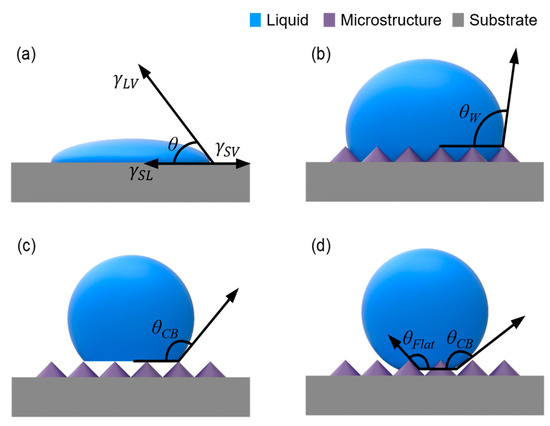 More than 200 years ago, the English physician Thomas Young described the forces acting on a liquid droplet spreading on a plain surface [25]. As shown in Figure 1a, the CA of the droplet (θ) is related to the interfacial energies at the solid-liquid (γSL), solid-vapor (γSV), and liquid-vapor (γLV) interfaces: