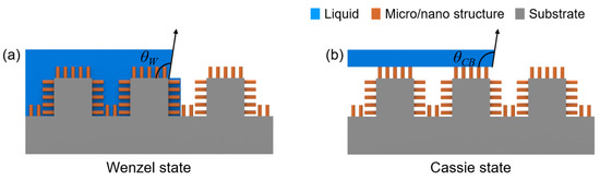 The above equation, however, is accurate only for completely smooth, chemically-homogeneous surfaces. The principle of superhydrophobicity was first outlined by Wenzel in 1936 [26], and then by Cassie and Baxter in 1944 [27]. Wenzel suggested that, if liquid contact follows the contours of a rough surface, then the roughness should accentuate the intrinsic wetting tendency towards either film formation or an enhanced contact angle. As shown in Figure 1b, in this model, the contact angle is defined by the Wenzel equation: