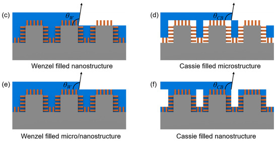 Schematic representation of possible wetting states on a micro/nanoscale rough hierarchical superhydrophobic surface: (a) Wenzel state; (b) Cassie state; (c) Wenzel filled nanostructure; (d) Cassie filled microstructure; (e) Wenzel filled micro/nanostructure; and (f) Cassie filled nanostructure.