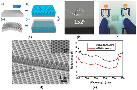 (a) Schematics of a nanocone film of an Au-coated template and PDMS nanocones: (i) A Si mold with hexagonally-ordered nanopillars was used as an imprint mold with four nanoimprint steps; (ii) An I-cone array fabricated by a multi-step anodization and wet etching process on the imprinted Al foil; (iii) Premixed PDMS poured on an Au-coated template followed by a degassing and curing process; (iv) Regular nanocones on flexible PDMS after peeling-off. (b) A drop of water on the nanocone PDMS film, showing a large contact angle of 152°; (c) Flexible nanocone film; (d) A SEM image of a Au-coated template with a 1-µm depth; (e) A reflectance measurement of a CdTe device with and without the nanocone structure. Reproduced from [65] with permission; Copyright Wiley 2014.