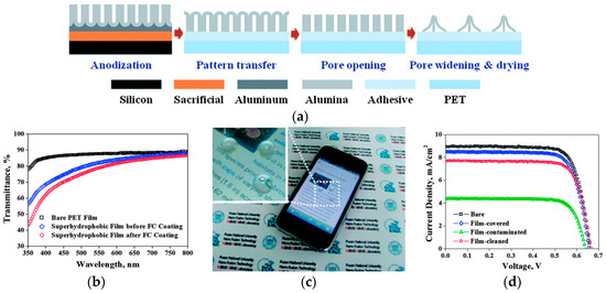 Furthermore, if optically-transparent superhydrophobic surfaces can be produced on mechanically-flexible substrates, such as a film-type material, they can potentially be employed on any curved surfaces for wider practical applications. Unfortunately, there are only a few reports dealing with functional superhydrophobic surfaces with both optical transparency and mechanical flexibility. Kong and his co-authors [66] reported a facile and scalable technique to fabricate self-cleanable superhydrophobic films that possess both optical transparency and mechanical flexibility. Figure 4a shows the fabrication process of the superhydrophobic film proposed in this paper. In the first step a porous alumina membrane (PAM) is formed that is then transferred to a polyethylene terephthalate (PET) film. Initially, a photoresist layer (PR) which acts as a sacrificial layer was formed on a silicon wafer by spin-coating and, subsequently, a thick aluminum (Al) thin-film using an electron-beam evaporation technique was deposited. Then, the deposited Al layer was anodized to form PAM by a standard anodization process. The processed specimen was bonded manually to an acceptor substrate, which is prepared by spin-coating the UV-curable polymeric adhesive on a bare PET film, under slightly-pressurized conditions. The polymeric adhesive layer of the bonded specimen was then fully cured by illumination with UV light. Subsequently, the PAM with a residual Al layer was transferred to the acceptor substrate by removing the sacrificial PR layer in an organic solvent. The bottom barrier layer of the PAM was then exposed by fully etching the residual Al layer using an aqueous solution of copper(II) chloride (CuCl2) and hydrochloric acid (HCl). Finally, the alumina nanopyramid (NP) structures, which were strongly attached to the fully-cured polymeric adhesive layer, were formed on the PET film through the chemical etching of the barrier layer and inter-pore walls on the PAM in aqueous phosphoric acid solution. In the first step, a 4-µm thick photoresist was spin-coated on a silicon wafer, followed by a baking process. Subsequently, Al deposition was carried out using an electron evaporation technique. The deposited Al layer was anodized to form a porous aluminum membrane (PAM) layer by a standard anodization process. The specimen was bonded manually to an acceptor substrate, which was prepared by spin-coating a UV curable polymeric adhesive on a bare PET film under slightly pressurized conditions. The polymeric adhesive layer was then fully cured by illumination of UV light. Subsequently, the PAM with Al layer was transferred to the acceptor substrate by removing the photoresist layer. Finally, alumina nanopyramid structures attached to the fully-cured polymeric adhesive layer were fully formed on the PET film by using a chemical etching barrier. Figure 4b shows the transparency of the functional film decorated with nanopyramid structures when using an optimized etching time of the PAM. The transmittance of the bare PET film at 550 nm (82%) increased to 88% after decoration with alumina nanoparticles (NP), due to the scattering effect of the nanoscale surface roughness. However, after modification with the hydrophobic FC coating, the transmittance at 550 nm decreases to 79%. Figure 4c shows the film attached to a mobile screen. Such optically-transparent film can be used as a protective cover for solar cell applications, windows, etc. To demonstrate the practical application of the fabricated flexible transparent film, it was used to cover dye-sensitized solar cells (DSSC). The photovoltaic performance before and after the self-cleaning process is shown in Figure 4d. The power conversion efficiency (PEC) of the bare device (4.39%) decreased to 4.1% after covering with the transparent superhydrophobic film, due to the optical loss of light transmitted through the film. After the covered device was coated with dust particles, the PCE value decreased to 2.14%. However, this value was restored to 3.82% after the self-cleaning process, and the current density (JSC) increased to 7.73 mA·cm−2. Hence, the photovoltaic performance of the DSSC had recovered 93.2% with respect to that of the DSSC covered with the as-prepared film. In comparison, the PCE of the DSSC without covering with the self-cleanable film recovered only 46.1% compared to that of the as-fabricated DSSC even after experiencing the same cleaning process. These results suggest that further optimization of the surface geometry would make it possible for the proposed superhydrophobic film to be considered as a self-energy-saving method by recovering the energy efficiency.