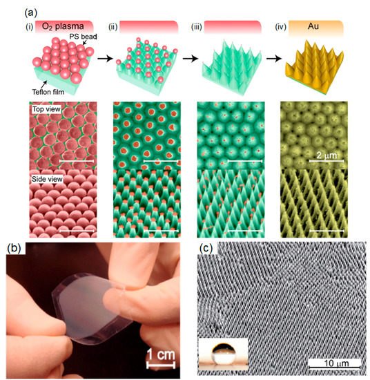 Arrays of nanostructures, such as nanocones, nanotips, nanopillars, and nanowires, have attracted great attention recently due to their notable characteristics, such as broadband antireflection and light trapping properties [67,68,69], strong hydrophobicity [70,71,72], and high surface area [73]. These arrays have applications in photonic [74] and photovoltaic devices [75], biological and chemical sensors [76], and self-cleaning surfaces [77]. The arrays of metal nanostructures also have the potential as blackbody materials due to their broadband antireflective and light absorption properties, which are induced by the excitation of localized surface plasmon resonance and their interactive coupling [78,79]. Incorporating the excellent optical properties of metal nanocone arrays into devices and components requires the development of simple, rapid, and scalable fabrication methods. Toma et al. [80,81] demonstrated a new method comprised of colloidal lithography and oxygen plasma etching for creating two-dimensional periodic gold nanocone arrays on flexible Teflon films. The fabrication process is illustrated in Figure 5a. As shown in Figure 5a(i), a colloidal monolayer is prepared on Teflon film by spin coating a solution of polystyrene beads. After drying the solvent, the surface was etched by oxygen plasma, during which the nanocone structures were formed due to both the polystyrene beads and Teflon film underneath being etched simultaneously (Figure 5a(ii,iii)). Then, the Teflon nanocones are coated with a thin layer of gold (Au) using a thermal evaporator, as illustrated in Figure 5a(iv). Both the top- and side-view images are given for the representative samples at each preparation step during the fabrication. As shown in Figure 5b, the surface of the Teflon film changed from glossy transparent to matte-white, indicating strong light scattering by the nanostructures. Figure 5c shows the SEM image representing a large-area view of the gold nanocone arrays, clearly showing that the nanocone array is comprised of multiple oriented domains of hexagonally-packed nanocones. A photograph of a water droplet with a volume of 10 µL on the gold nanocone array is inserted in Figure 5c. The contact angle was measured to be 145°, which is quite close to a value of a superhydrophobic surface, 150°, indicating that the structure of the nanocone array has superhydrophobicity due to trapped air pockets in the interspaces among the nanocones.