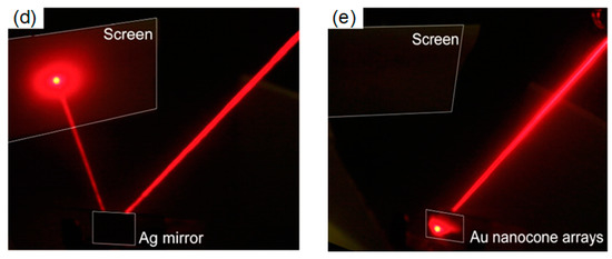 The antireflective properties of the gold nanocone arrays prepared with polystyrene nanobeads and the plasma-etching process is demonstrated in Figure 5d,e, in which a He-Ne laser with wavelength of 633 nm was incident on, and reflected by, a silver mirror and gold nanocone arrays, respectively. While almost no light is reflected from the nanocone array to form a spot on the screen, the flat silver film exhibited strong reflection.