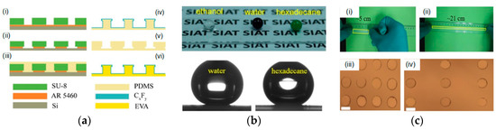 The fabrication process of SLS EVA film is illustrated in Figure 6a(i–vi). Firstly, a thin positive photoresist and a thick negative photoresist were spin-coated on a Si substrate. The photoresist layer was over-developed after patterning the thick negative photoresist layer to form T-shaped patterns using an ultraviolet mask aligner. Then, by using PDMS as the curable material, the inverse T-shaped patterns on a dual layer resist was transferred to PDMS mold through two successive soft replication processes. After low surface energy treatment of the PDMS mold for easy demolding, a VAE emulsion was poured onto the PDMS mold and cured at 4 °C to form the structured EVA film. Then, the inverse T-shaped patterns on the dual layer resist substrate were transferred to the EVA film and finally treated with fluorinated self-assembled monolayer (PFTS, F-SAM) at 70 °C for 10 min to achieve low surface energy. Due to the excellent flexibility, the as-fabricated EVA film can be decorated on various complex surfaces, and provide ordinary surfaces with universal non-wetting performance. The EVA SLS adhered well to paper, and showed excellent transparency and superoleophobic performance (Figure 6b). The CA of EVA SLS film is 157.6° for water and 148.8° for hexadecane, as shown in Figure 6b. As shown in Figure 6c(i–iv), the EVA SLS film could be stretched from 5 to 21 cm and fully recovered. During the stretching process, the size of microstructures remained nearly constant, while the pitch distance increased, which is shown in Figure 6c(iii,iv). The stretching decreases the solid fraction, which enhances the apparent contact angle (θ) according to Equation (5). It is seen that the value of θ decreases with the increasing solid fraction for all the liquids. In addition, by tuning the adhesion force through stretching, the EVA SLS surface can be used as a “tweezer” for lossless droplet transfer for various liquids, including water and oil. This approach is low-cost, very easy to control, highly scalable, and widely applicable; therefore, it may have many interesting applications as a surface microfluidics platform. Diverse hierarchical surface designs have been introduced as superhydrophobic surface structure, because multiscale geometries could greatly improve the superhydrophobicity [91,92,93,94,95].