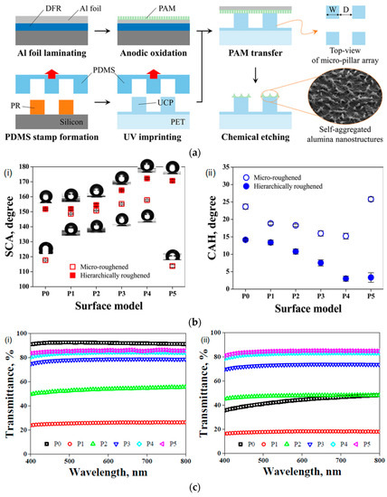 Recently, more efforts have been made to demonstrate mechanically-flexible superhydrophobic films using various techniques, such as template-assisted polymer replication and subsequent decoration with nanoscale structures [96,97], and polymer replication with hierarchically-structured templates [98,99]. In addition to self-cleaning and mechanical flexibility, optical transparency of the functional surfaces is also an important factor in many fields, such as super-repellent solar panels, anti-fogging glasses, and raindrop-repellent windows. Due to the lack of efficient fabrication techniques, it is difficult to find a simple, cost-effective, and low-temperature method. Overcoming the tradeoff between the critical performance parameters of superhydrophobicity and optical transparency according to the surface roughness levels is also challenging. Hence, Kim and his co-authors [100] reported an anodic oxidation of aluminum technique as the simplest way for fabricating nanoscale features, such as nanopores and nanopillars. The proposed technique is a combination of UV imprinting and AAO technique, as illustrated in Figure 7a. The fabrication of the polymeric micropillar arrays started with the formation of an elastomeric stamp based on a standard soft lithography technique. Using the soft-lithography technique, a photoresist mold was prepared in a silicon wafer substrate. Then, premixed PDMS was poured on the prepared mold, followed by thermal curing at 70 °C for 1 h. For the UV printing process, microholes on the PDMS stamp were first filled with a UV-curable polymer by manual drop-casting. After UCP filled the PDMS stamp, a polyethylene terephthalate (PET) film was pressed onto it, and the UCP was fully cured by irradiating with UV light (20 mW/cm2, 10 min) through the transparent PET film. The periodic polymeric micropillar arrays were finally transferred to the PET film by carefully separating the PDMS stamp. In particular, various micropillar arrays were fabricated with different interpillar distances (D) of 30–150 µm, and a step of 30 µm with respect to the fixed pillar width of 30 µm (P1–P5). Furthermore, for the AAO process, 20-µm thick Al foil was laminated on a silicon wafer with a sacrificial dry film resist. Then, the Al foil was anodized to form PAM in a beaker containing an oxalic acid solution. The PAM was bonded to the polymeric micropillar arrayed film with a thin adhesive, which was contact printed on the pillars’ top surface, followed by UV curing with the same irradiation conditions. During chemical etching of the PAM, the regular size of nanopores was controlled. With further increases in the etching time, the PAM with nanopores was eventually transformed into nanowires with high aspect ratios. These micropillars were used to evaluate the surface wettability and transparency properties under various surface morphologies. As shown in Figure 7b, the sliding angle (Figure 7b(i)) measured on the micro-roughened surface gradually increased, when the edge-to-edge distance increased to 100 µm (denoted as P4), and suddenly decreased when the edge-to-edge distance increased to 150 µm. However, for the case of the hierarchically-roughened surface, the sliding angle gradually increased.