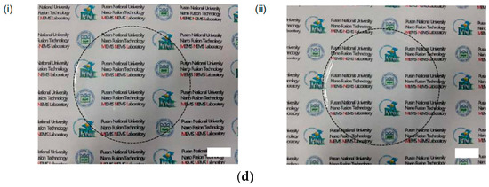 Similarly, the CAH also decreased for both films, as demonstrated in Figure 7b(ii), and their transmittance is demonstrated in Figure 7c. The transmittance of bare PET film is 92% at a wavelength of 550 nm, which decreased after roughening the surface. The full transmittance curves of the two roughened films at visible wavelength (400–800 nm) are illustrated in Figure 7c(i,ii), showing higher transmittance values in the micro-roughened films than the hierarchically roughened one, for all surface designs. Similarly, photographs of large-area superhydrophobic surfaces fabricated on PET and glass substrates are shown in Figure 7d(i,ii), which clearly demonstrate the wide applications of this cost-effective fabrication method.