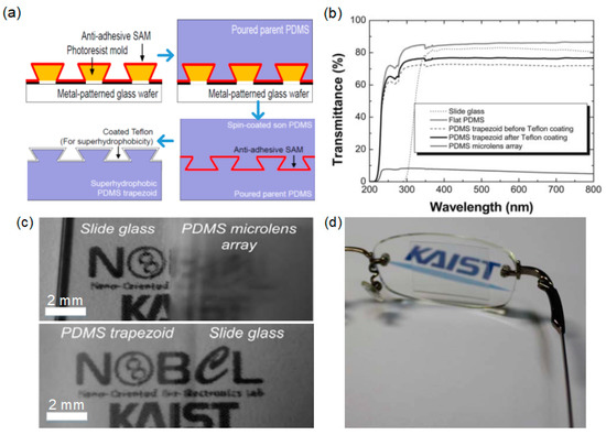 (a) Schematic diagrams of the two consecutive PDMS replication processes; (b) Transmittance characteristics of various samples as a function of the wavelength of the incident light; (c) Photographs of logos underneath the superhydrophobic PDMS trapezoids array and the superhydrophobic PDMS microlens array; (d) A photograph of the PDMS trapezoids sample on one eyeglass lens. Reproduced from [64] with permission; Copyright RSC 2010.