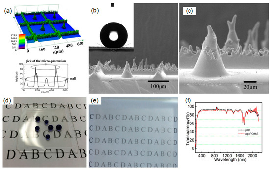 Recently, Gong et al. [102] demonstrated an efficient method to produce a flexible superhydrophobic PDMS surface with high transparency. Using femtosecond laser processing, they fabricated a stainless steel template, which was comprised of an array of microgrooves with microholes, as shown in Figure 9a. The PDMS solution was poured on the template to make a specific structure comprised of a microwall array with a specific distance between each other, and a microprotrusion at the center of a plate surrounded by microwalls (Figure 9b,c). As shown in Figure 9d,e, excellent transparency and superhydrophobicity were achieved by using the optimized side length of the microwalls and the height of the microcone. The PDMS surface shows superhydrophobicity with a maximum water CA of 154.5° ± 1.7° and a transparency over 91%, a light loss of less than 1% compared with flat PDMS in the visible range (Figure 9f). Lee et al. [103] reported a three-dimensional hierarchical wrinkled PDMS surface that can exhibit superhydrophobicity even after being repeatedly stretched. They produced these surfaces by molding against polystyrene (PS) templates designed by sequential wrinkling. As shown in Figure 10a, a soft CFx skin layer was deposited by reactive ion etching (RIE) on the polystyrene wrinkles, which led to PS wrinkles with CFx layer to enhance the superhydrophobicity. Thereafter, PDMS was cured against the PS master mold to create monolithic PDMS slab with wrinkles. Figure 10b demonstrates that the prepared PDMS slab has almost identical features with that of PS.