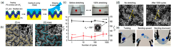 Monolithic formation of 3D hierarchical wrinkles in PDMS: (a) Process of casting PDMS against PS mold; (b) SEM images of hierarchical wrinkles on (i) PS mold and (ii) inverted structures on PDMS; (c) Superhydrophobicity satisfying both θW > 160° and θH < 3° was maintained on the 2D PDMS surface even after 1000 stretching cycles; (d) SEM images of surfaces before stretching and after 1000 cycles of stretching; (e) Optical images of water shedding on substrates under twisting, bending, and downward bending. Reproduced from [103] with permission; Copyright ACS 2014.