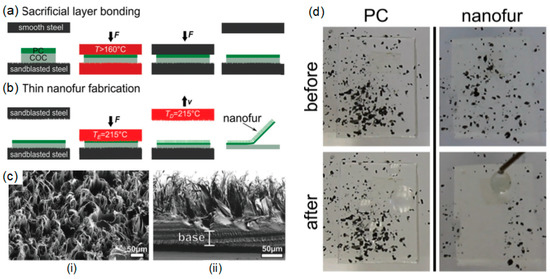 Bioinspired thin nanofur films mimic transparent hairs covering plant leaves. (a,b) Schematic of the fabrication process. PC and COC are bonded together in the hot embossing step. Softened PC fills the cavities of the finely sandblasted top mold pressed into the polymer. Retraction of the mold pulled out the softened PC, creating a crafted surface covered in a dense layer of nano- and micro hairs. The thin nanofur film is then separated from the sacrificial COC layer. (c) SEM images of the thin nanofur film: (i) top view and (ii) cross-section. (d) Self-cleaning of the superhydrophobic thin nanofur film (bottom) in comparison to the unstructured PC film (top). Left: graphite powder was distributed on both surfaces. Right: dispensed water droplets stuck to the unstructured PC film, but rolled down the thin nanofur film, picking up graphite particles and effectively cleaning the surface. Reproduced from [104] with permission; Copyright Wiley 2016.