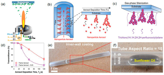 Despite different techniques, fabricating re-entrant textures on nonflat surfaces has proven extremely challenging. Another important issue limiting the real world impact of superoleophobic surfaces is their complicated fabrication routes and their limited transparency. Hence, Wong et al. [105] presented an approach that enables the rapid, omnidirectional synthesis of flexible, and up to 99.97% transparent, superhydrophobic and oleophobic textures on many variable surface types. A three-port burner was used for the flame spray pyrolysis process. A solution mixture of toluene and hexamethyldisiloxane was fed though a custom-built nozzle, and atomized with oxygen gas. The resulting spray was ignited with a premixed methane/oxygen flame. Thereafter, a clean glass slide was placed above the burner. Highly-transparent SiO2 nanoparticles were coated on the glass. Figure 12b shows the schematics of the nanotexture self-assembly approach. A home-built CVD reactor was used to chemically functionalize the silica nanoparticles. For silane deposition, a silica particle-coated glass slide was placed inside the CVD reactor together with 100 µL of 1,1,2,2-perfluorooctyl silane. As shown in Figure 12c, upon self-assembly of these SiO2 nanotextures, a superoleophobic surface was easily obtained by vapor silanization of trichloro(1,1,2,2-perfluorooctyl)silane. The transparency of these nanotextures is shown in Figure 12d. Using the deposition time of 15 s, the transparency at 600 nm reached 100. When the deposition time was increased to 120 s, a thicker surface resulted in a 13% loss of transmittance. The fluorosilinization was found to enhance the optical losses by 0.03% and 6% for aerosol deposition time of 15 and 120 s, respectively. These superolephobic textures were applied to a variety of uneven profiles, such as the inner side of a bowl-shaped crucible, the inner walls of a closed-end tube, and a much thinner glass tube with an aspect ratio of 15. Successfully nanotexturing of the latter was indicated by balling up of the introduced oil in the Cassie-Baxter state. We concluded that the present method brings a significant advance in imparting transparency and superamphiphobicity to an inapplicable family of materials and geometries for multifunctional applications (Figure 12e,f).