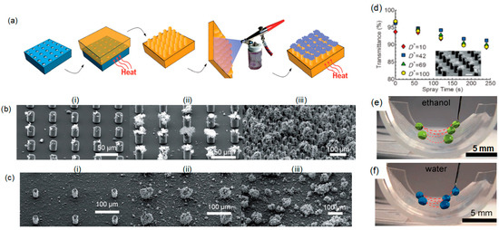 Alternatively, another concept was demonstrated to develop transparent superomniphobic surfaces, which have a range of applications such as coatings for windows, phones, tablets, and computer screens. Golovin et al. [106] have reported a facile method to create flexible and highly-transparent superomniphobic surfaces that can repel a range of liquids with low or high surface tension. A simple cost-effective spray method on master-molded PDMS pillars was used for these surfaces. As shown in Figure 13a, the synthesis method is comprised of photolithography and spraying. Using photolithography, uniform square arrays of holes were fabricated on a silicon master mold. Initially, a thick layer of photoresist was spin-coated on a silicon wafer, and baked for 90 s at 115 °C. The layout of the micropattern was defined by exposure to 365 nm UV light. Then, inductively-coupled plasma reactive ion etching was used to develop 20-µm and 40-µm deep micropore arrays in the exposed region. A PDMS mixture was poured over Si masks at room temperature. The mixture was degassed and subsequently cured for 3 h at 80 °C. Then, the PDMS was removed from the mask, leaving square arrays of pillars. Thereafter, a solution mixture of 1,1,2,2-hepadecafluorodecyl polyhedral oligomeric silsesquioxane (F-POSS) and PDMS was prepared and sprayed on the PDMS pillars. Spraying polymers with low surface energy can result in controllable reentrant texture with oleophobic characteristics. During the fabrication process, molds were prepared with D* values ranging from 10 to 100. (D* is a measure of the solid-liquid interfacial area: D* = ((R + D)/R)2. 2R is the diameter of the texture, and 2D is the inter-feature spacing). The modified Cassie-Baxter relationship can be rewritten in terms of D*: