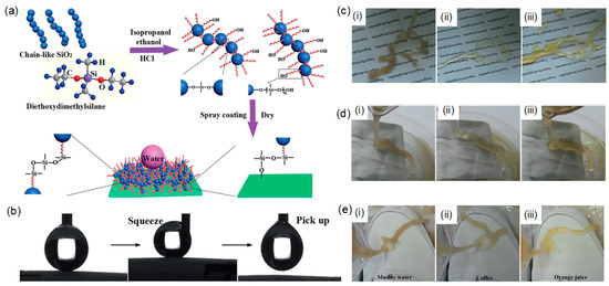 (a) Schematic illustration of the fabrication of environmentally safe and transparent superhydrophobic coatings on various substrates via the nanoparticle self-assembly method. (b) The dropping, squeezing, and picking up of a water droplet, showing the low adhesive force on superhydrophobic paper. Three common liquid contaminants ((i) muddy water, (ii) coffee, and (iii) orange juice) were poured on prepared superhydrophobic coatings on (c) paper, (d) fabric, and (e) a shoe surface, to test the antifouling ability of the coating. Reproduced from [107] with permission; Copyright RSC 2014.