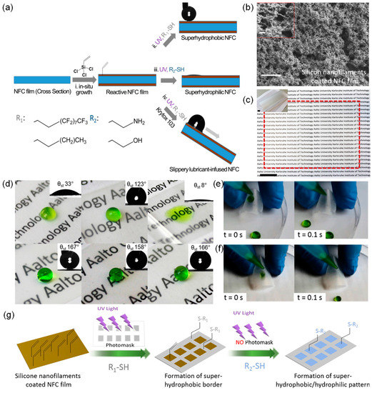 Many efforts have been made to replace glass and plastic films with sustainable materials with competitive strength, thermal expansion coefficients, transparency, and heat resistance. Films and nanopapers prepared from nanofibrillated cellulose (NFC) are ideal alternatives, since they are mechanically strong, lightweight, transparent, non-toxic, and biocompatible. Taking the above advantages into account, NFC films have been considered in recent years for use in electronic devices including displays, transistors, organic light emitting diodes, touch screens, lithium ion batteries, solar cells, transparent conductive electrodes, and antennas. Thus, there is a corresponding need to find fabrication methods that could tailor properties of the NFC films to generate additional functionality and improve their applicability. Hence, Guo et al. [111] reported a novel and facile process to functionalize the patterns and tailor the wetting properties of NFC films. The process is comprised of the deposition of nanosilicone filaments using in situ polycondensation of trichlorovinylsilane (TCVS), with further functionalization using the thiol-ene reaction. The prepared slippery, lubricant-infused NFC films repelled both water and organic liquids. The detailed fabrication process is schematically illustrated in Figure 15a. The NFC films modified with the TCVS-silicone nanofilaments (SNFs) were placed on a glass slide, wetted with 1,1,2,2-perflurodecanethiol solution in ethyl acetate, and covered with a photo mask. The covered NFC film was immediately cured with UV light with a wavelength of 260 nm for 5 min to prepare superhydrophilic areas. The NFC film was redeposited on a glass slide and covered with a quartz slide after addition of 100 µL of cystemine hydrochloride. After 1 min exposure to UV light, the NFC film was completely rinsed with ethanol and dried with a nitrogen flow. The prepared NFC film carrying the hydrophobic-hydrophilic patterns was kept in a room temperature environment. Similarly, NFC films containing TCVS-SNFs were reacted with 1,1,2,2-perflurodecanethiol solution under UV light with a wavelength of 260 nm for 5 min. After a proper cleaning process and drying with nitrogen gas, the film was impregnated by spreading 20 µL∙cm−2 lubricant fluid (Krytox 103) and kept for 2 h to ensure spontaneous, complete wicking throughout the capillary structures of the films. Thereafter, the NFC film was positioned vertically overnight to drain excess lubricant. As shown in Figure 15b, the SEM image of the NFC film shows TCVS SNFs. Figure 15c shows the 20-µm NFC film that is flexible, translucent, strong, and easy to handle. The wettability of the superhydrophobic/superhydrophilic NFC films created via thiol-ene click reaction was demonstrated in Figure 15d. The static contact angle of bare NFC film is 33°, confirming the hydrophilic characteristic of cellulose, which comprises of hydroxyl group and oxygen-containing groups. The surface with TCVS-SNFs, in contrast, shows a micro/nanostructured layer with a static contact angle of 123°.