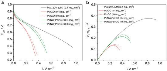 To obtain suitable catalyst loadings of 0.4 and 0.6 mgPt cm−2 within electrodes, sufficient quantities of commercial Pt/C, Pt/rGO and Pt(NW)Pd/rGO suspensions were added to separate sample vials and 113 µL of 10 wt % Nafion solution were added to each. In the case of Pt/C, 0.875 mL of IPA was added to disperse the catalyst black. The catalyst inks were sonicated by a 130 W, 20 kHz sonication horn for 10 min at 20% power. The gas diffusion electrodes (GDEs) were made by coating the catalyst inks through painting onto 16 cm2 Sigracet 35 BC carbon paper gas diffusion layers (GDLs). After leaving them to dry at room temperature, the electrodes were hot-pressed to a 36 cm2 piece of Nafion® 212 membrane at 1800 lb load for 2 min at 135 °C with commercial JM Pt/C anodes with a catalyst loading 0.4 mgPt cm−2. The GDE surface was imaged using a Philips (Amsterdam, The Netherlands) XL-30 FEG Environmental SEM operating at 20 kV.
