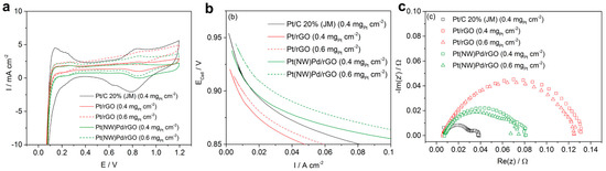 Poly(N-vinyl-2-pyrrolidine) (PVP-K30, molecular weight = 30,000–40,000), H2PtCl6 (8 wt % in H2O), PdCl2, formic acid HCOOH, Isopropyl alcohol (IPA) and L-Ascorbic acid were purchased from Sigma-Aldrich (Dorset, UK). The PdCl2 was dissolved in water to provide a solution of concentration 0.125 g mL−1. All other chemicals were used as received. The single-layer graphene oxide (GO) dispersion (thickness 0.43–1.23 nm, diameter 1.5–5.5 µm, dispersed in water at 2 wt %) was purchased from U.S. Research Nanomaterials, Inc. (Houston, TX, USA). Johnson–Matthey (JM) electrocatalysts with 20 wt % Pt supported on carbon black (Pt/C 20 wt %) was purchased from Alfa Aesar (Lancashire, UK). The water used throughout was purified with a Millipore (Hertfordshire, UK) system.