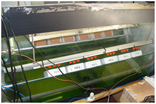 A heater maintained the temperature of the suspension at 24 °C and two wave pumps agitated the algal culture to avoid sedimentation of cells and to guarantee the ideal conditions for algal growth. Illumination was provided by two neon lamps that simulate daylight (1500 lux) for the photosynthesis of algae, while two UV lamps guaranteed 8 W/m2 on the surface of treated specimens to activate photocatalytic power of TiO2. Relative humidity (RH) in the chamber was 80%, but it reached 90% during water sprinkling.