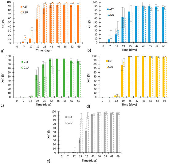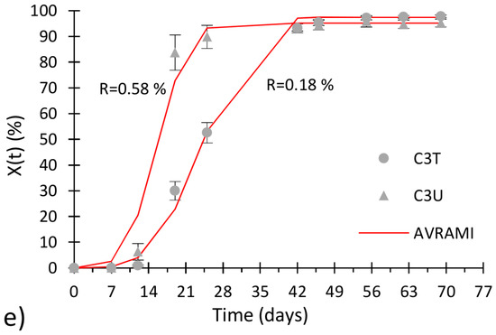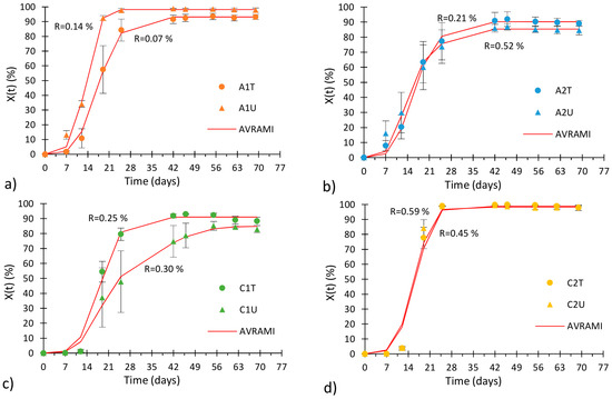 Figure 4 shows a very good agreement between X(t) experimentally evaluated and X(t) from the Avrami’s model. The minimum R2 is equal to 0.978 (C3U), denoting that calculated data fit the experimental ones. This can be also appreciated in Figure 5 where the analytical curve is overlapped to the experimental values.