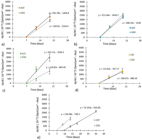 Number of algal spots with standard deviations (±): (a) A1 specimen; (b) A2 specimen; (c) C1 specimen; (d) C2 specimen; (e) C3 specimen. Regression lines and equations are reported for treated specimens (solid line), and untreated ones (dashed line).