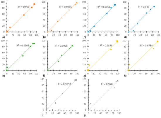Correlation plots between experimental X(t) (x-axis) and analytical X(t) (y-axis): (a) A1T specimen; (b) A1U specimen; (c) A2T specimen; (d) A2U specimen; (e) C1T specimen; (f) C1U specimen; (g) C2T specimen; (h) C2U specimen; (i) C3T specimen; (j) C3U specimen. Dot lines are the bisectors.