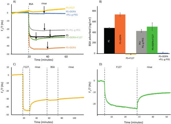 It is clear that F127 is no longer repelling protein after a 24 h soak, while the PLL-g-PEG coated polydopamine remains protein rejecting. The trend of F127 to be unstable at the surface was also evident in Figure 1, where the frequency continued to drift upward throughout the measurement. These problems have also been described in literature by several groups. For example, Marsh et al. [] reported XPS analysis which proved that after 24 h in PBS, the Pluronic coating had washed off, and Su et al. [] showed that after immersion in water for one week, the polystyrene originally coated in F127 had near plain polystyrene contact angles [,].