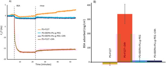 The frequency shift recorded for the 24 h buffer-soaked Pluronic surface, subject to BSA, was −19.2 Hz, corresponding to 340 ng/cm2 ± 68.9 ng/cm2. This is a significant difference to the coat spared the 24 h treatment (p < 0.05). Additionally, it can be seen that the buffer rinse after BSA adsorption does not cause the 24 h soaked F127 (PS+F127 +24 h in Figure 2A) surface to drift as dramatically, as it does the un-soaked coating (PS+F127 in Figure 2A), indicating that the pre-soaked surface has lost much of the anti-fouling Pluronic already. The DOPA + PLL-g-PEG coating however, showed no significant difference after 24 h of buffer soak (p > 0.05), as is clearly depicted in Figure 2. This shows that the polydopamine assisted grafting of PLL-g-PEG will provide the desired protein resistance for a longer time and is thereby a possible solution to overcome the life-span problems encountered by the physisorbed F127 modified surfaces. Judging by the life-span reported in literature for PLL-g-PEG on negatively charged surfaces, this coating could last much longer than the 24 h tested. One report shows that flowing HEPES buffer for one week, resulted in a loss of less than 5% mass of the polymer, while another group had reported PLL-g-PEG was stable and protein-rejecting for at least three weeks on surface-modified polystyrene microspheres [].