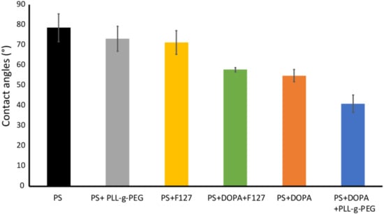 Average contact angles, with standard deviations (error bars), for all surface coatings investigated.