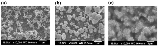 SEM images of (a) the Pt electrode fabricated through thermal decomposition; (b) the Pt electrode fabricated through electrochemical deposition; and (c) the Pt electrode fabricated through chemical reduction.
