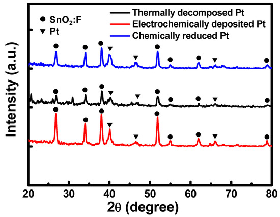 Subsequently, this study adopted XRD to analyze the Pt electrode fabricated through thermal decomposition, electrochemical deposition, and chemical reduction, respectively. The result of the XRD measurement is displayed in Figure 3. The XRD signal peaks for FTO conductive substrates (SnO2:F) were found at 26.5°, 33.8°, 37.9°, 51.7°, 54.8°, 61.7°, and 78.4°. The peak values of the XRD signals corresponding to Pt were 39.7°, 46.4°, and 67.5°, and the corresponding lattice planes were (1, 1, 1), (2, 0, 0), and (2, 2, 0). Moreover, the signal peaks for the Pt electrode fabricated through electrochemical deposition were significantly higher than those for the Pt electrodes fabricated through thermal decomposition and chemical reduction, indicating that the Pt electrode fabricated using electrochemical deposition had a relatively satisfactory crystallinity. The surface morphology, structure size, distribution density, and crystallinity of Pt electrode would affect the conductivity and catalytic activities of the Pt CE.