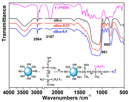 FTIR spectra of silica xerogels before and after F-PMHS modification were recorded and represented in Figure 1. Before FTIR characterization, the modified silica xerogel has been extracted with hexane for 48 h to remove F-PMHS which did not covalently bind to the silica particles. For pure silica xerogel, there are absorption bands observed at around 3450 cm−1, 2964 cm−1, 1630 cm−1, 1090 cm−1, 954 cm−1, and 800 cm−1. The broad absorption band at around 3450 cm−1 is attributed to Si–OH bonds or absorbed water [16,17]. The three peaks around 2964 cm−1 corresponds to the stretching vibration of C–H bonds from –CH3 [18]. The water deformation band appear at about 1630 cm−1 [19]. The absorption bands at around 1090 cm−1 and 800 cm−1 are the characteristic absorption band of Si–O–Si bond due to the asymmetric and symmetric vibration, respectively [20,21]. The absorption band at 961 cm−1 is attributed to –Si–OH [22]. After F-PMHS surface modification, there are two new absorption bands at 900 cm−1 and 2167 cm−1 corresponding to –Si–C and –Si–H of F-PMHS, respectively [23]. In addition, the intensity of absorption band at 2964 cm−1 is strengthen while that of absorption band at 961 cm−1 is weakened gradually with the increasing F-PMHS concentration. The latter demonstrates convincingly that –Si–H groups of F-PMHS react with the hydroxyl groups of silica particles by dehydrogenation and, hence, F-PMHS chains are covalently grafted onto the surface of silica particles.